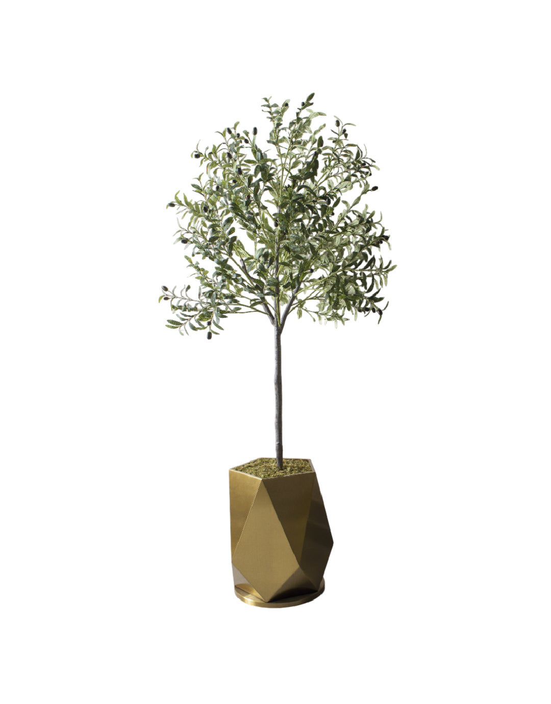 Añade un toque de sofisticación a tus espacios con esta macetera de diseño geométrico contemporáneo. Su estructura facetada y acabado metálico dorado la convierten en una pieza decorativa que destaca tanto en interiores como en exteriores.