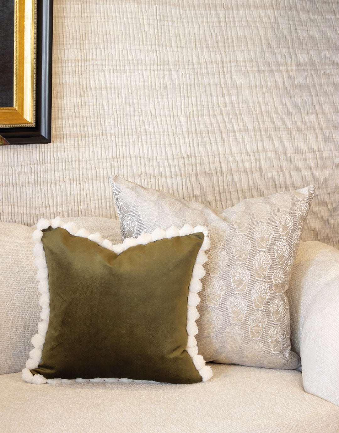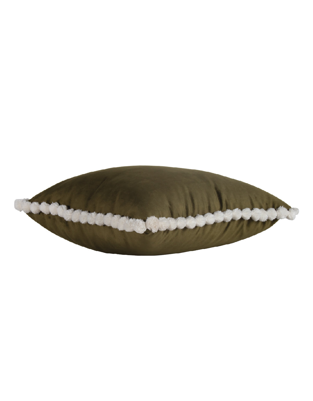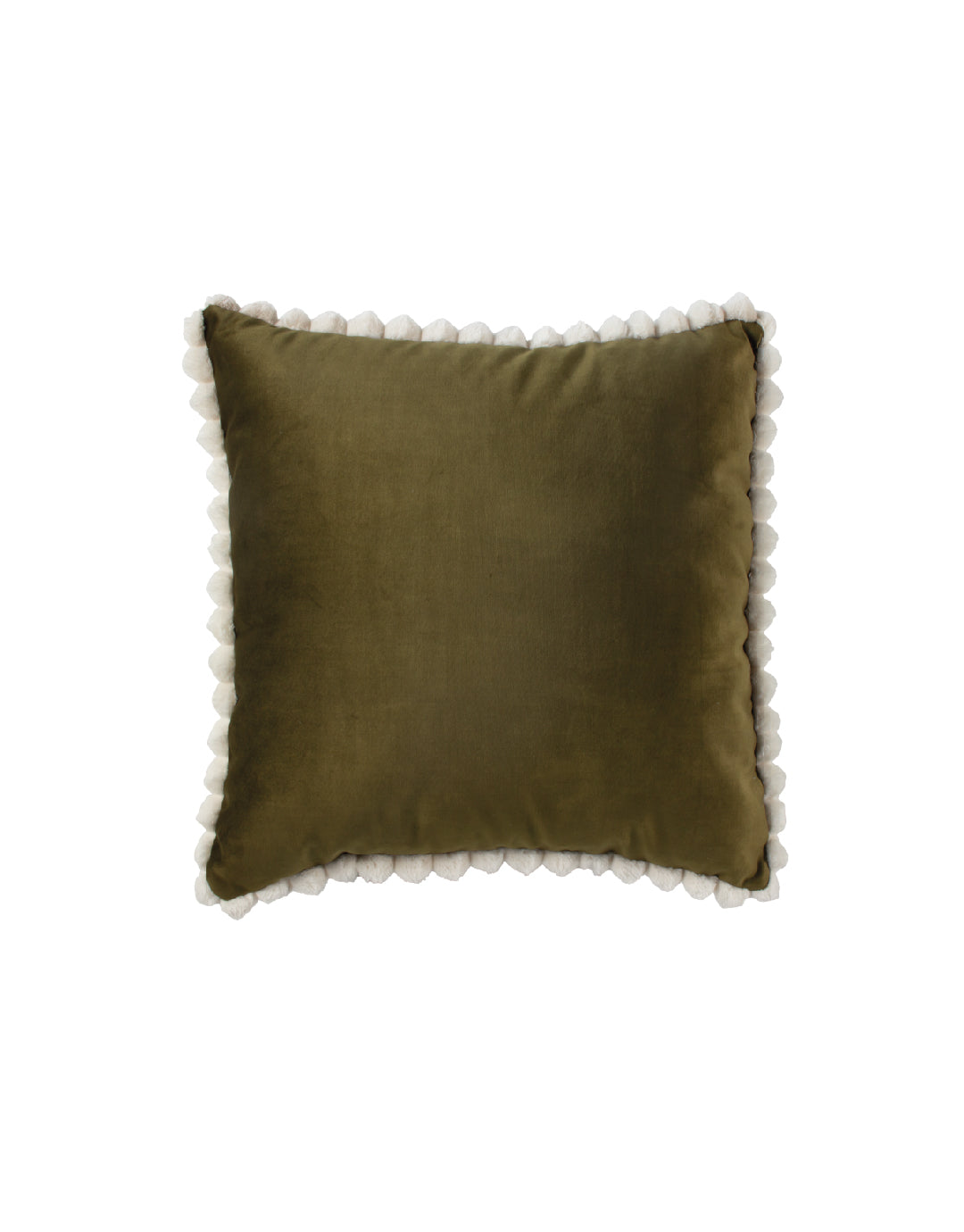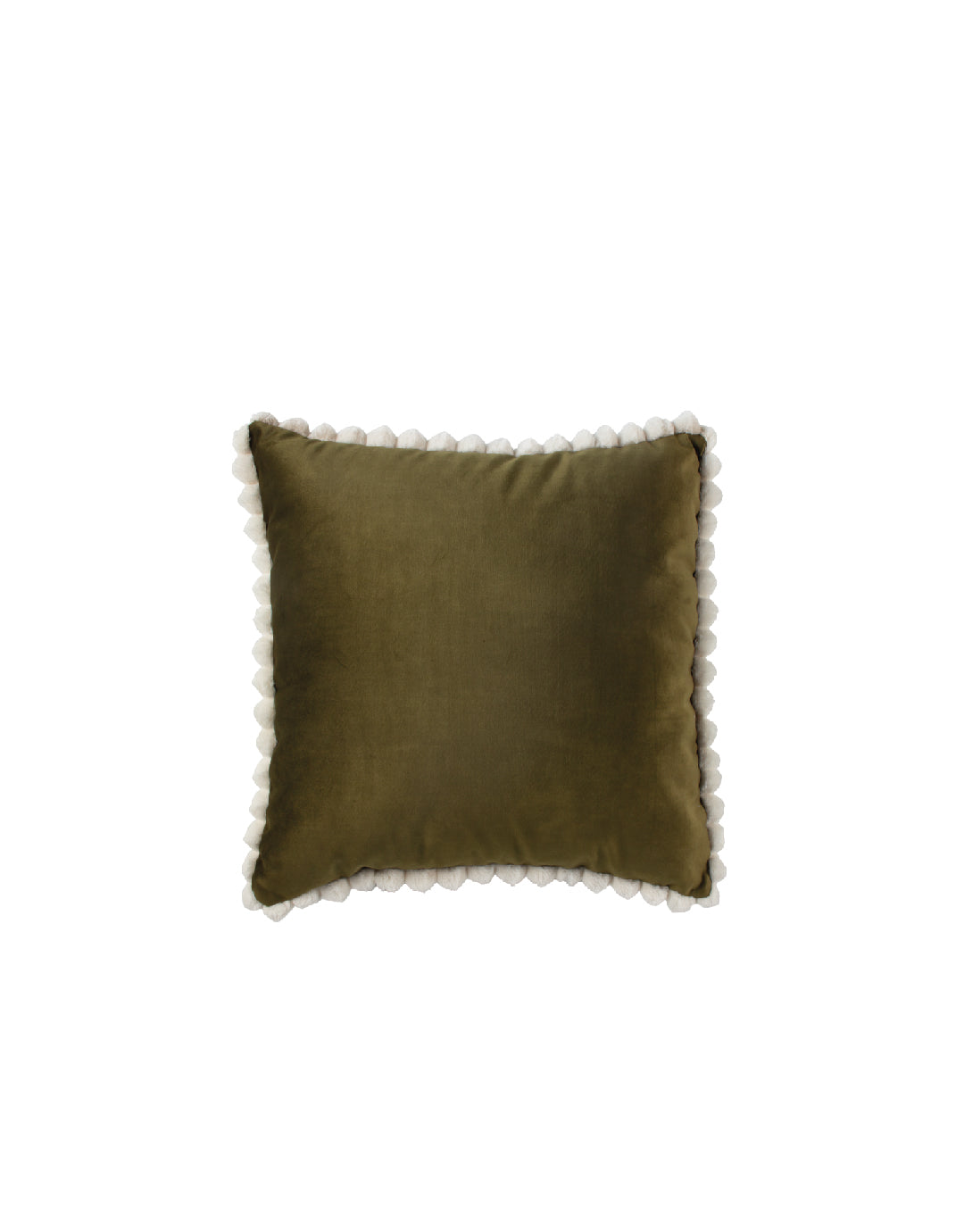 Dale un aire sofisticado y acogedor a tu espacio con este cojín en un elegante tono verde. Su acabado aterciopelado y el detalle del ribete negro con diseño ondulado aportan un toque de distinción y contraste. Ideal para complementar sofás, sillones o camas con un estilo cálido y contemporáneo