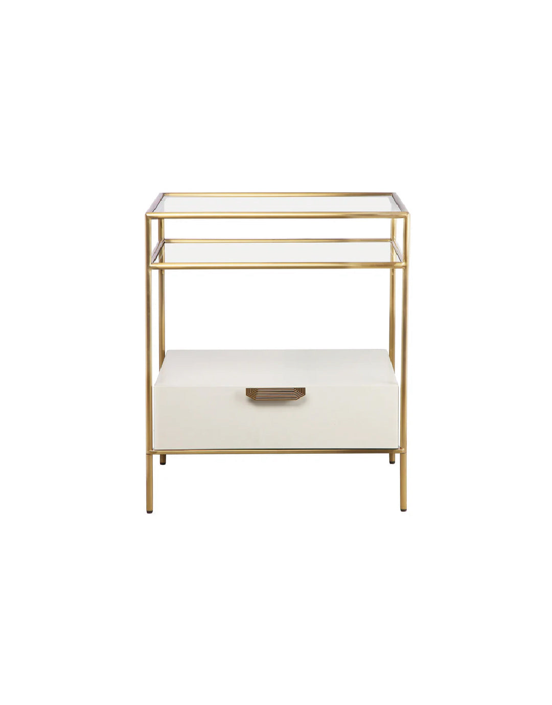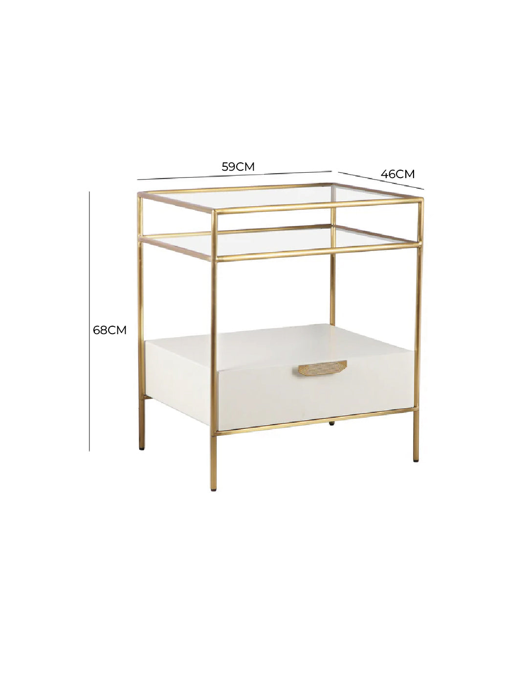 Añade un toque de drama discreto a tu dormitorio con la mesita de noche de cristal color crema Darla, diseñada para un montaje sencillo sin renunciar al estilo. Su hermosa silueta se ve acentuada por una estructura de latón cepillado que brilla sutilmente junto a cualquier cama. Con una tapa y un estante de cristal, además de un tirador de cajón llamativo, esta mesita de noche combina a la perfección forma y función para realzar la decoración de tu dormitorio.