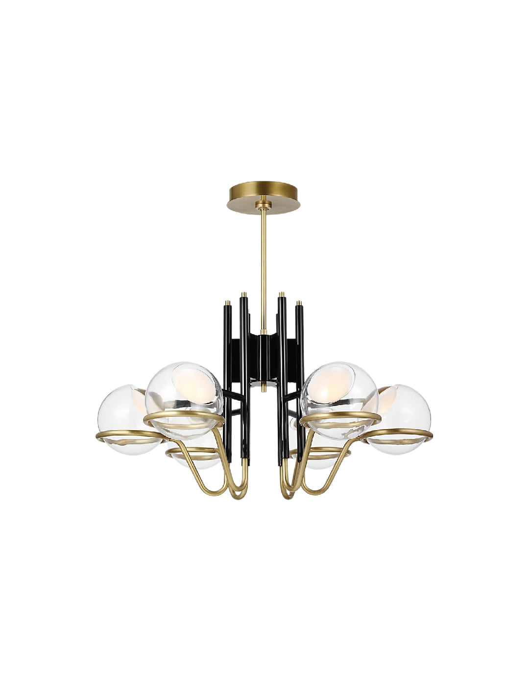 La lámpara de araña mediana Crosby de AvroKO combina el resplandor del estilo italiano de los años 70 con un diseño impactante y a la vez sencillo. Distintiva de su delicadeza musical, la armadura de metal negro brillante da paso a una elegante arpa de latón que sostiene un globo de cristal que dispersa la luz con fluidez e ilumina cualquier espacio a la perfección.