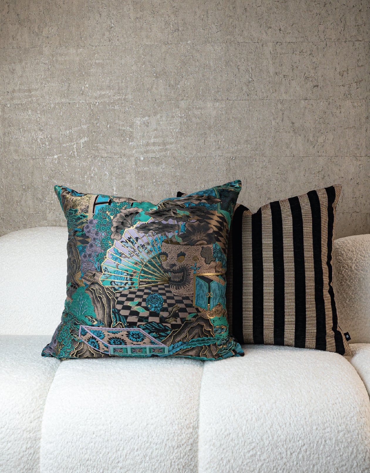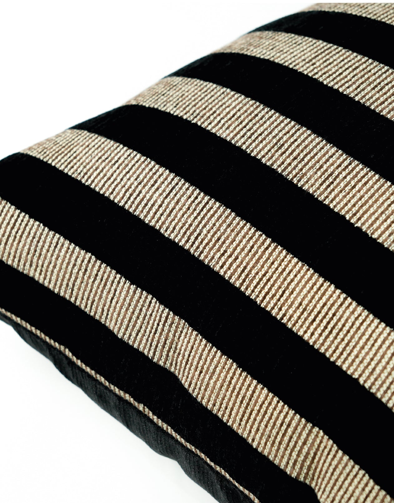 Añade un toque chic y sofisticado a tu decoración con el Cojín Hani Black Stripes. Su diseño elegante y lúdico presenta cebras en movimiento sobre un fondo en tono azul aterciopelado, creando una pieza única y llamativa para cualquier espacio.