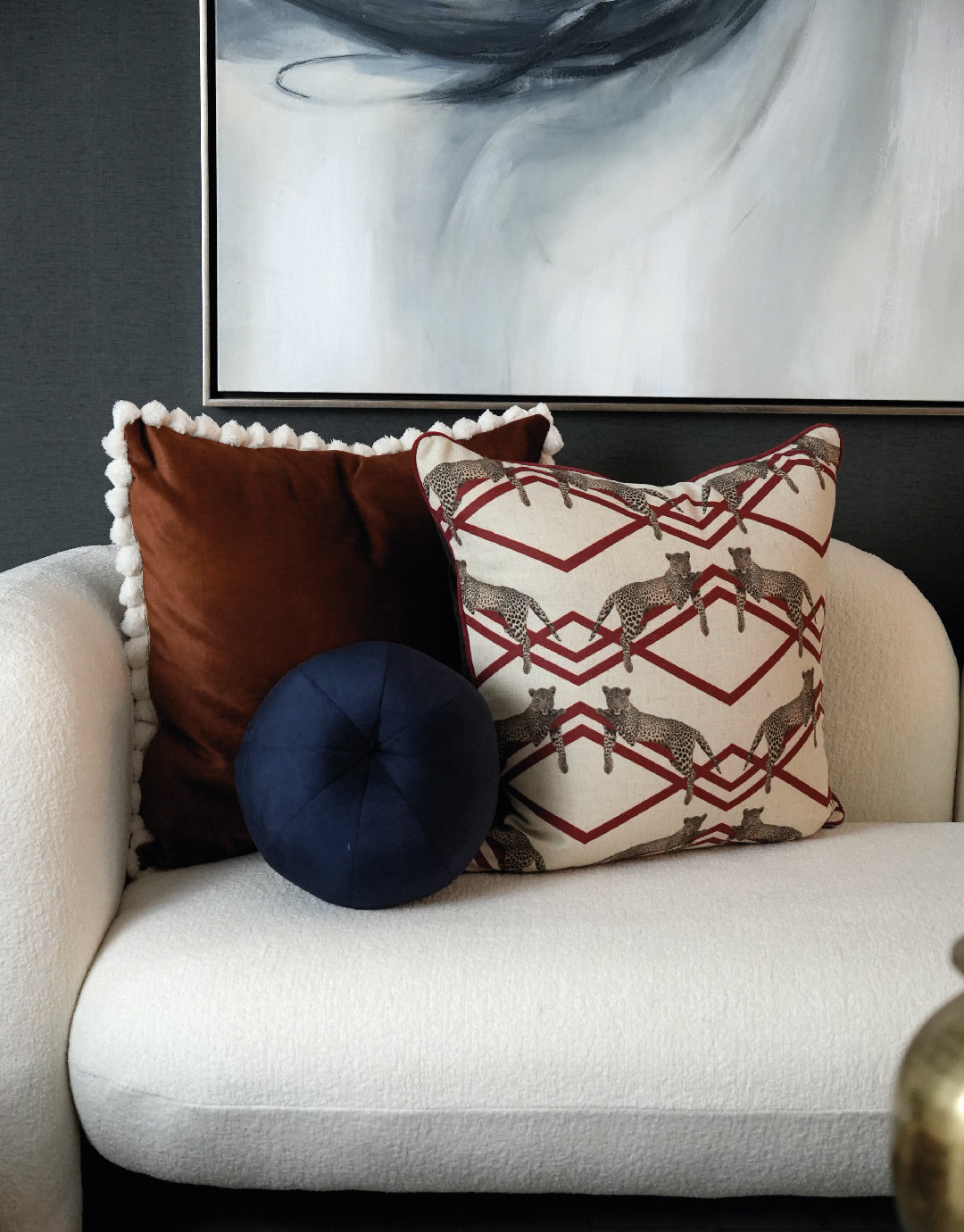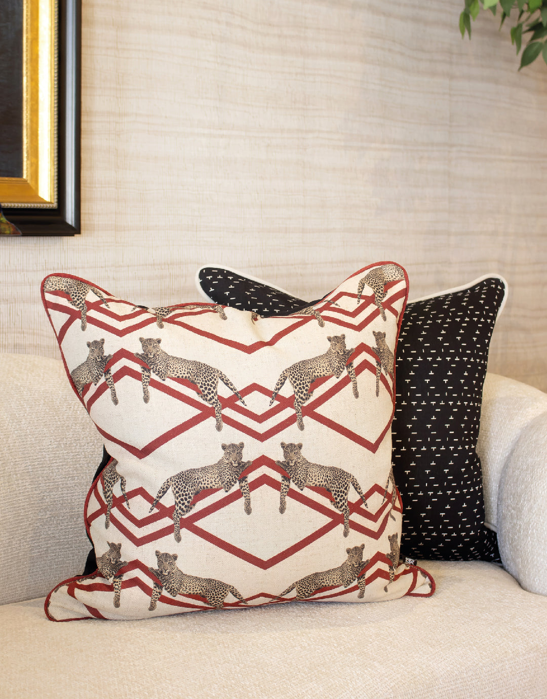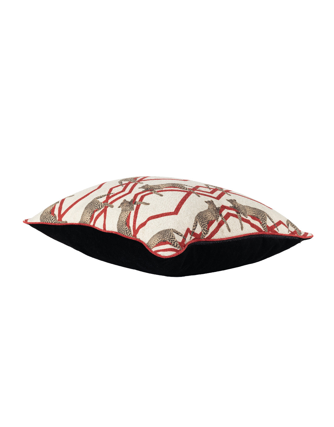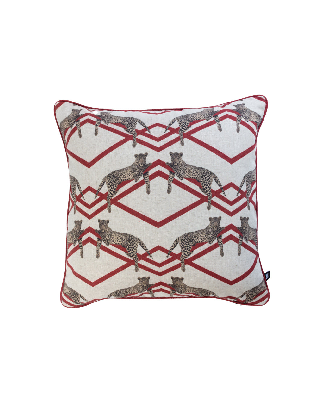 Eleva tu decoración con el Cojín Jinx Carmine, una pieza que fusiona la elegancia animal con un diseño geométrico moderno. Su patrón presenta leopardos en actitud relajada sobre una base neutra con líneas carmesí, creando un contraste sofisticado y dinámico. Este cojín es la opción ideal para quienes buscan un toque salvaje con una estética refinada.
