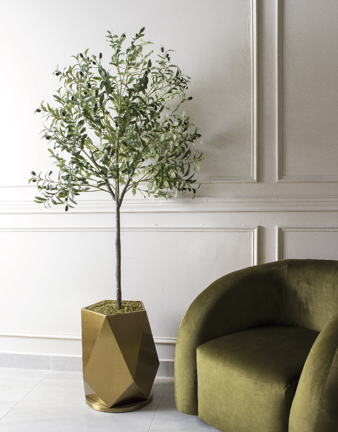 Añade un toque de sofisticación a tus espacios con esta macetera de diseño geométrico contemporáneo. Su estructura facetada y acabado metálico dorado la convierten en una pieza decorativa que destaca tanto en interiores como en exteriores.