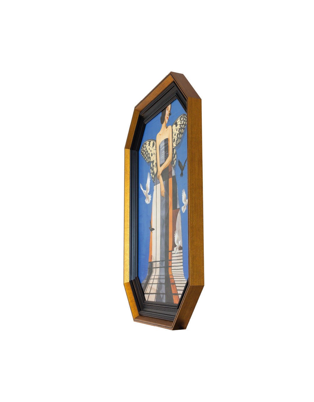 Este cuadro presenta una imagen elegante y simbólica. La mujer con alas de mariposa transmite una sensación de transformación y libertad, mientras que las aves a su alrededor, tanto blancas como negras, pueden representar la dualidad entre la luz y la sombra, la paz y el conflicto. El vestido geométrico con tonos fríos y cálidos añade un contraste interesante, dándole un aire moderno y estructurado, casi arquitectónico. El fondo azul vibrante refuerza la sensación de ligereza y ensueño.