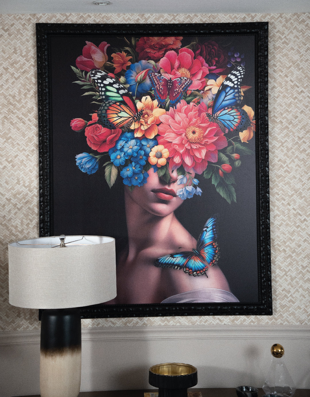 Una representación etérea y elegante de una mujer cuyo rostro se fusiona con un vibrante arreglo floral. Mariposas de colores revolotean entre las flores, aportando un toque de delicadeza y movimiento. La combinación de tonos intensos sobre un fondo oscuro resalta la luminosidad de la composición, evocando una sensación de misterio y feminidad. Ideal para espacios que buscan una pieza sofisticada y onírica.