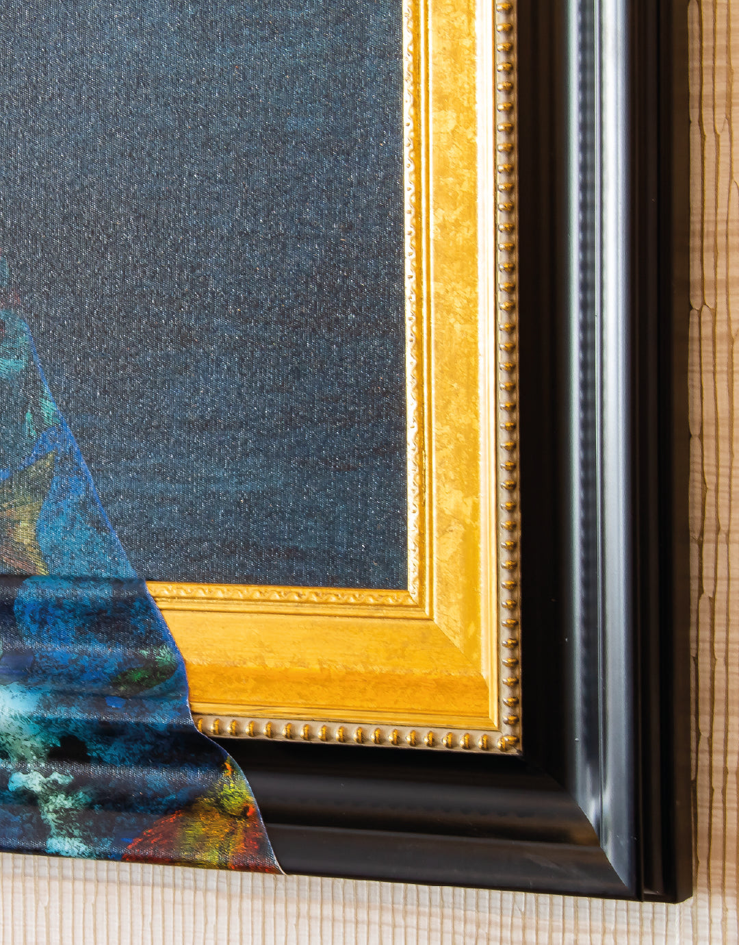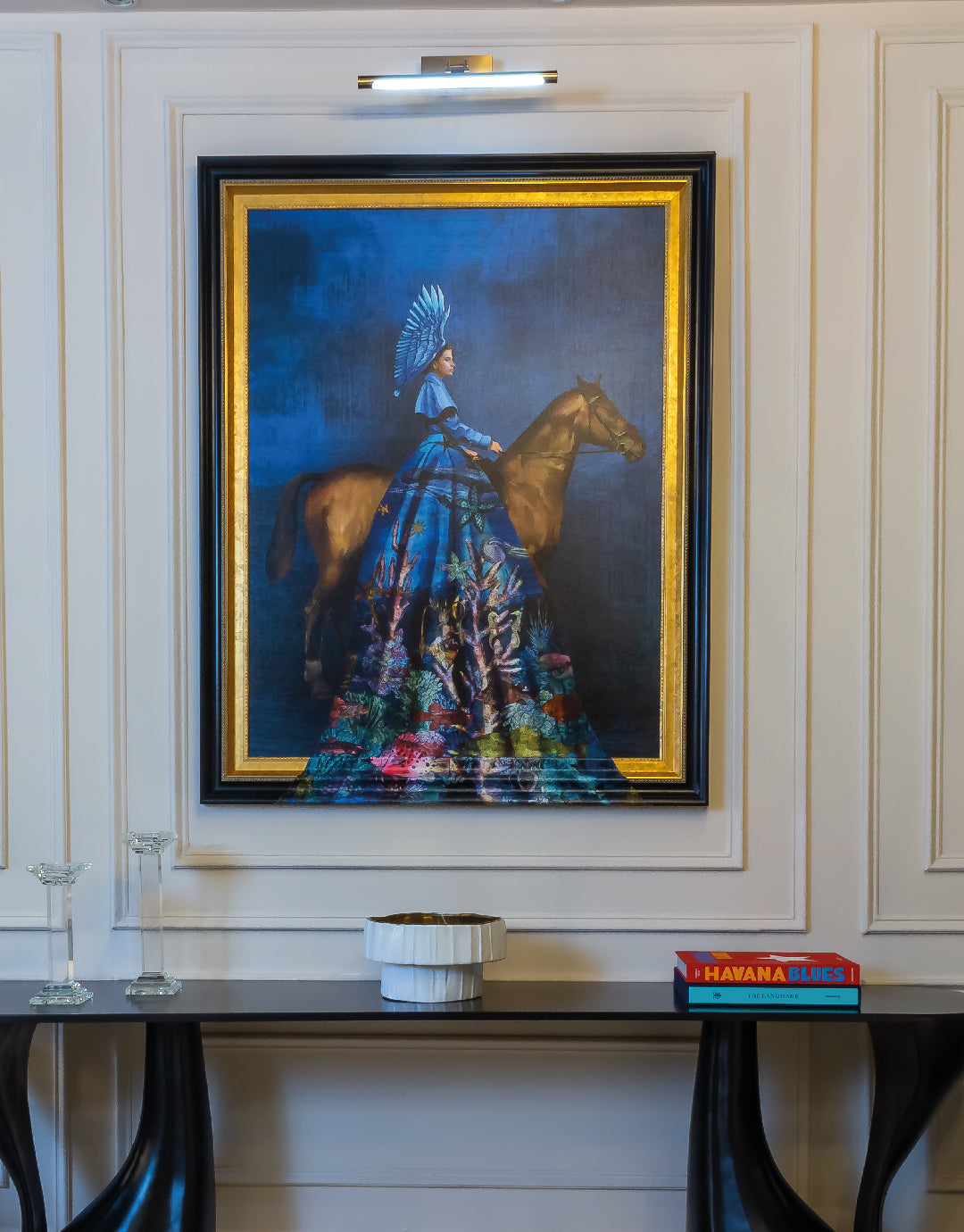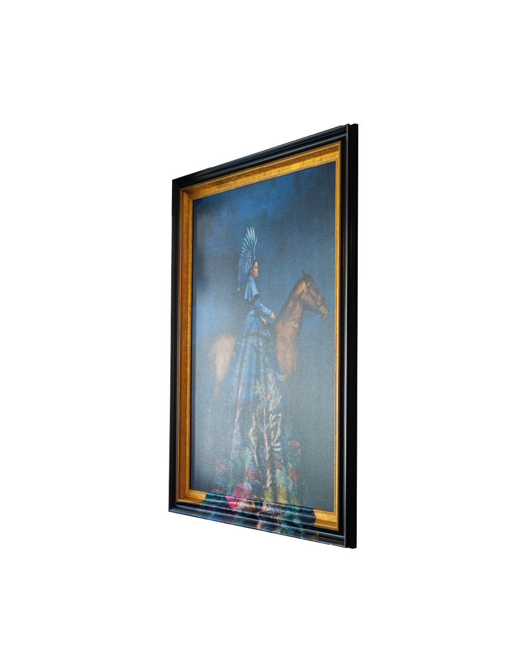 Este cuadro tiene un estilo surrealista y elegante. La figura femenina montada en el caballo luce un vestido que se transforma en un océano lleno de corales y peces, lo que le da una fusión artística entre la naturaleza terrestre y marina. El fondo azul oscuro y el marco dorado resaltan la riqueza visual de la obra.