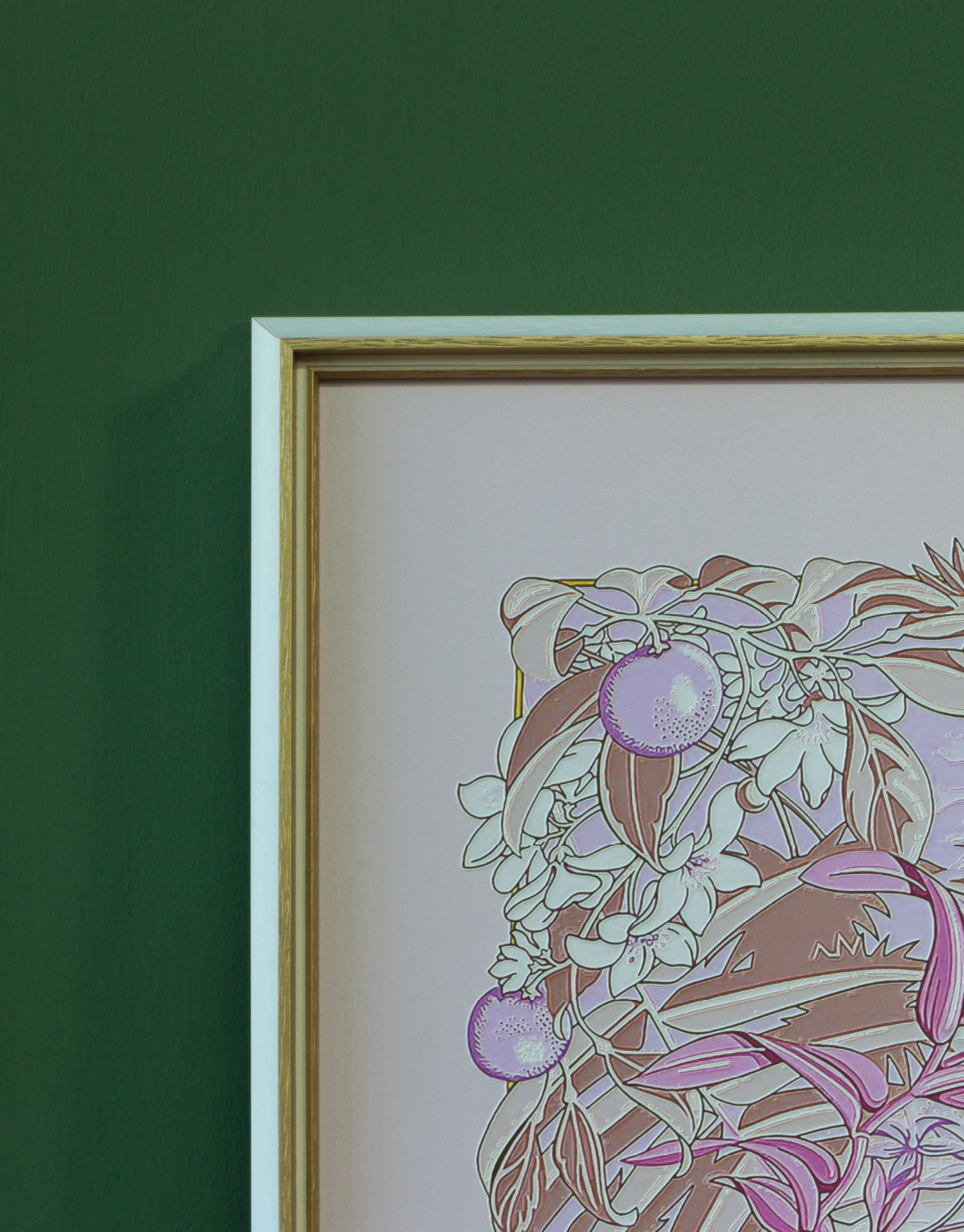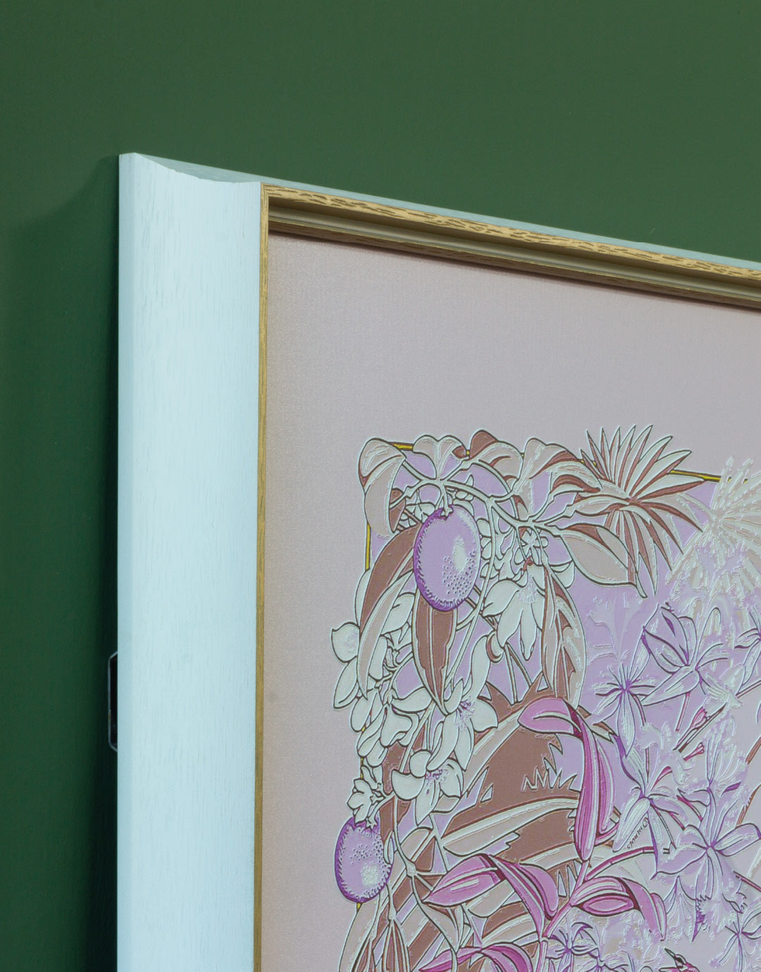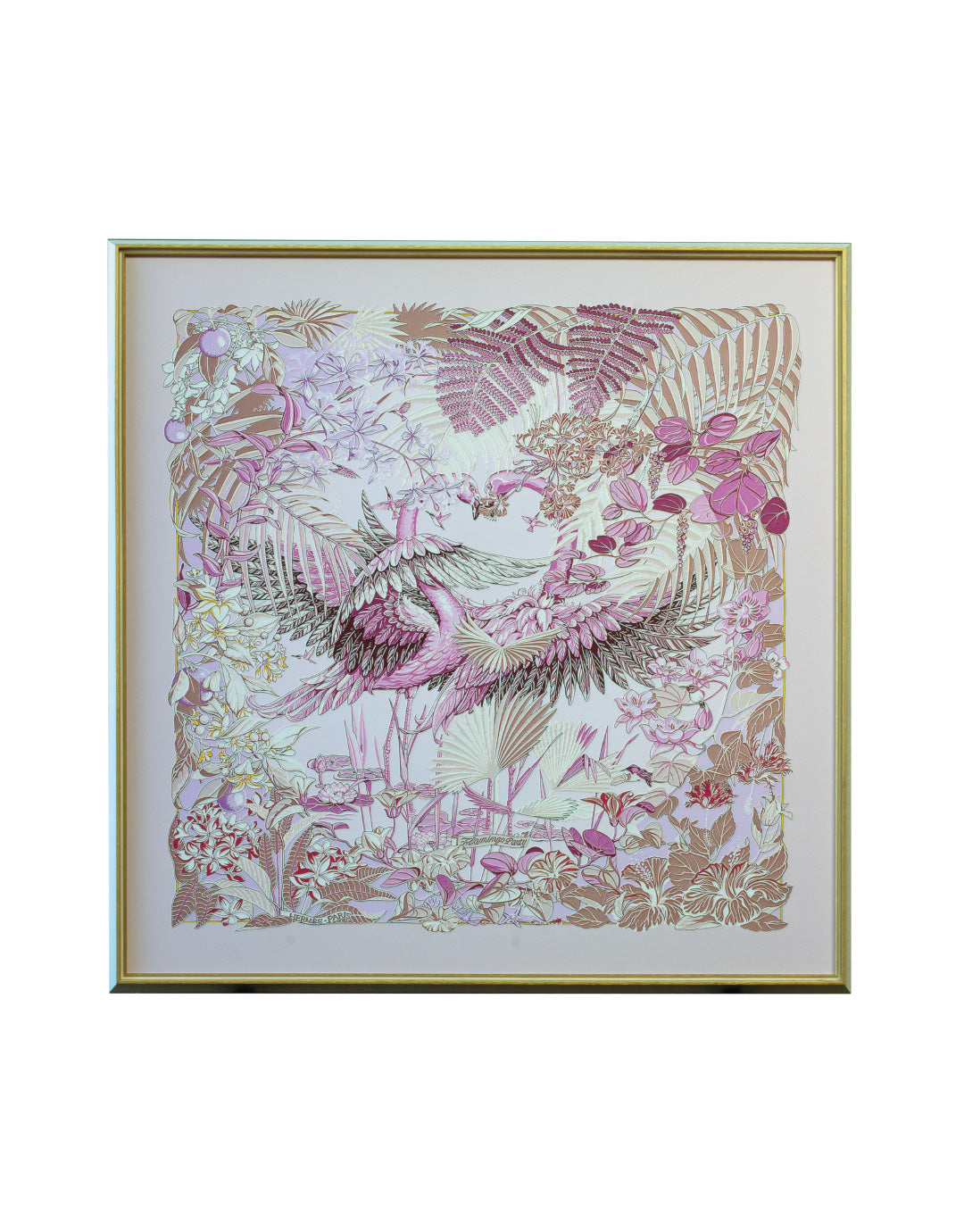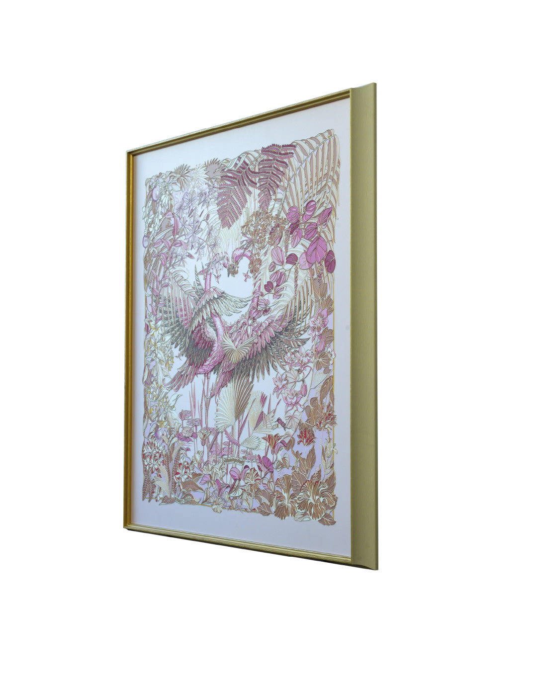 Este elegante cuadro presenta un cautivador diseño de aves exóticas rodeadas de exuberante vegetación y delicadas flores en tonos rosados y marrones. La composición detallada y armoniosa evoca una atmósfera de serenidad y sofisticación, convirtiéndolo en una pieza perfecta para realzar cualquier espacio con un toque de naturaleza y arte refinado.