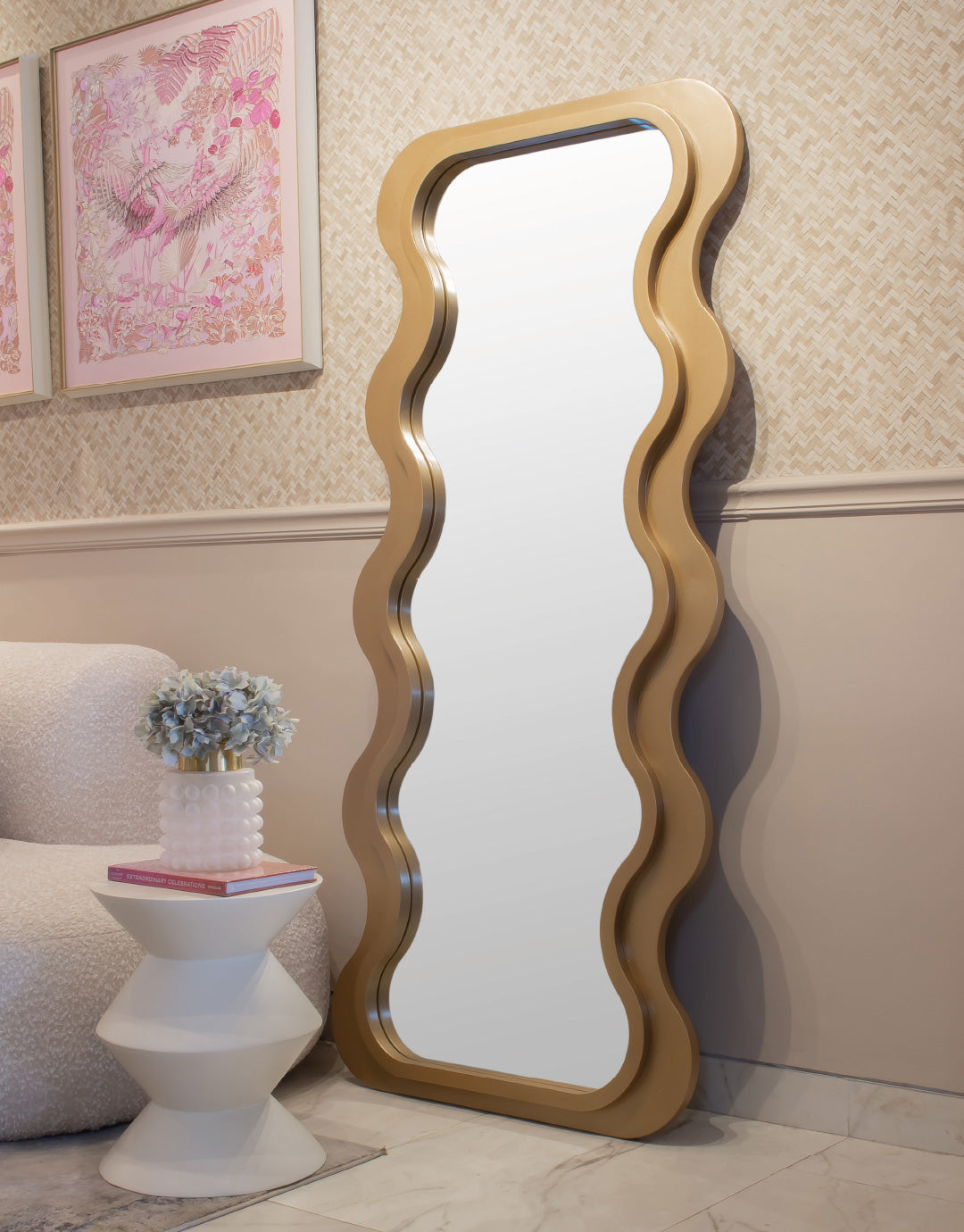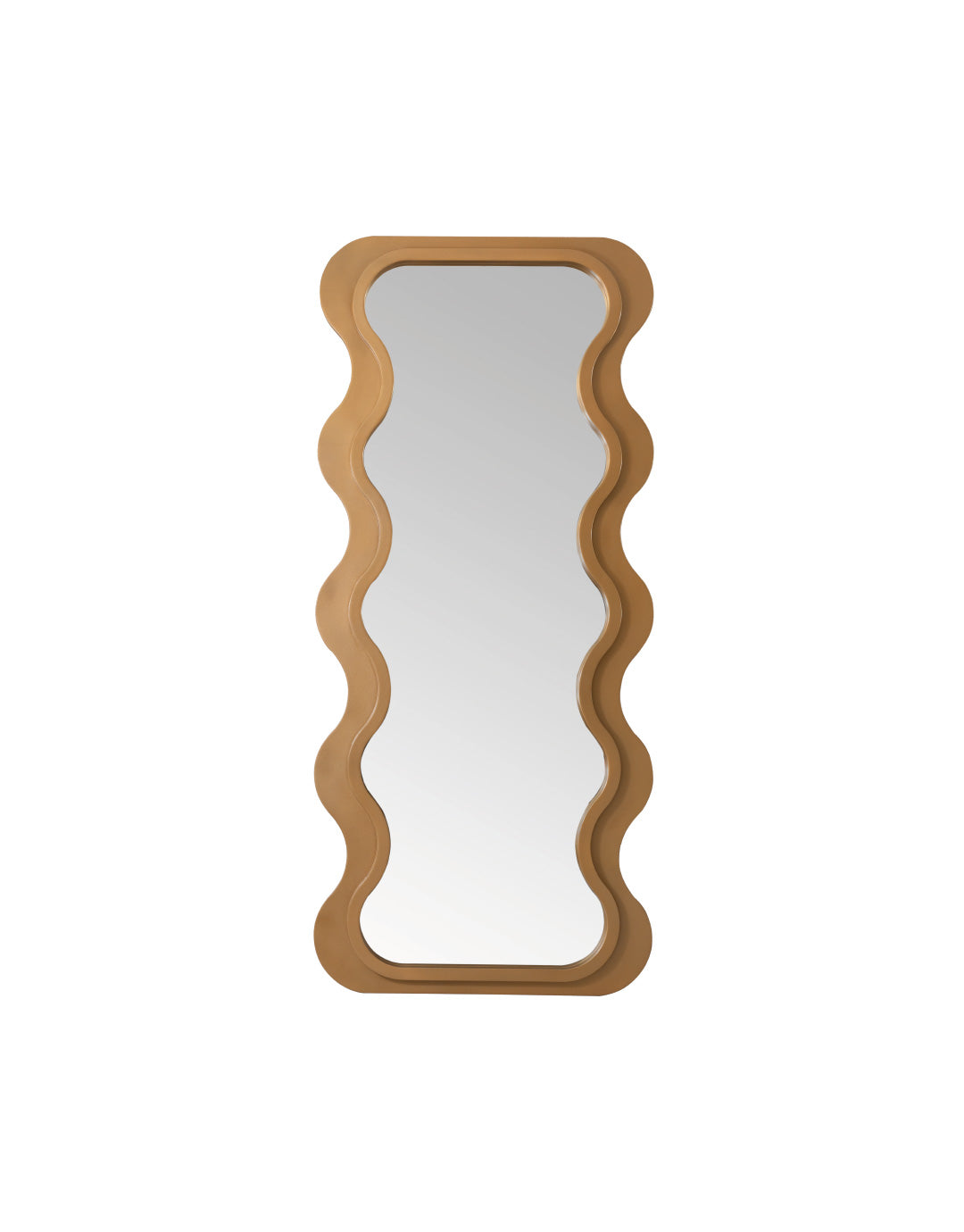 Este espejo decorativo transforma cualquier espacio con su diseño moderno y su marco ondulado en color dorado. Aporta dinamismo y elegancia, realzando la decoración con su estilo distintivo y sofisticado.