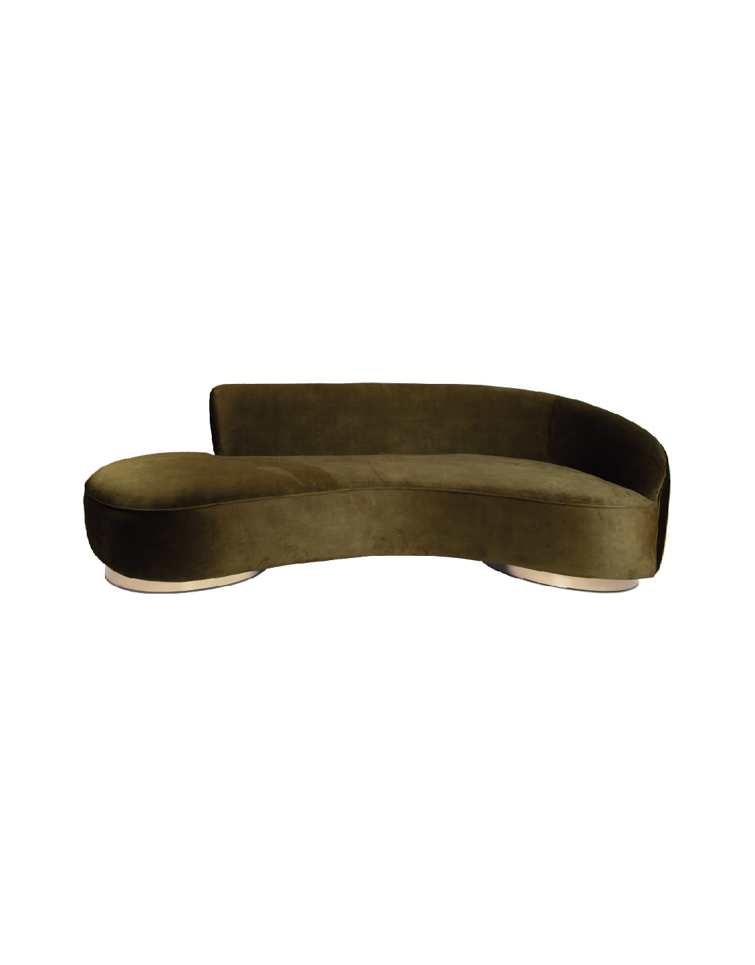 Eleva el estilo de tu espacio con el Sofá Elsa, un diseño curvo tapizado en terciopelo verde olivo que combina elegancia y confort. Su base metálica dorada añade un toque moderno y sofisticado, ideal para salas o áreas de recepción.