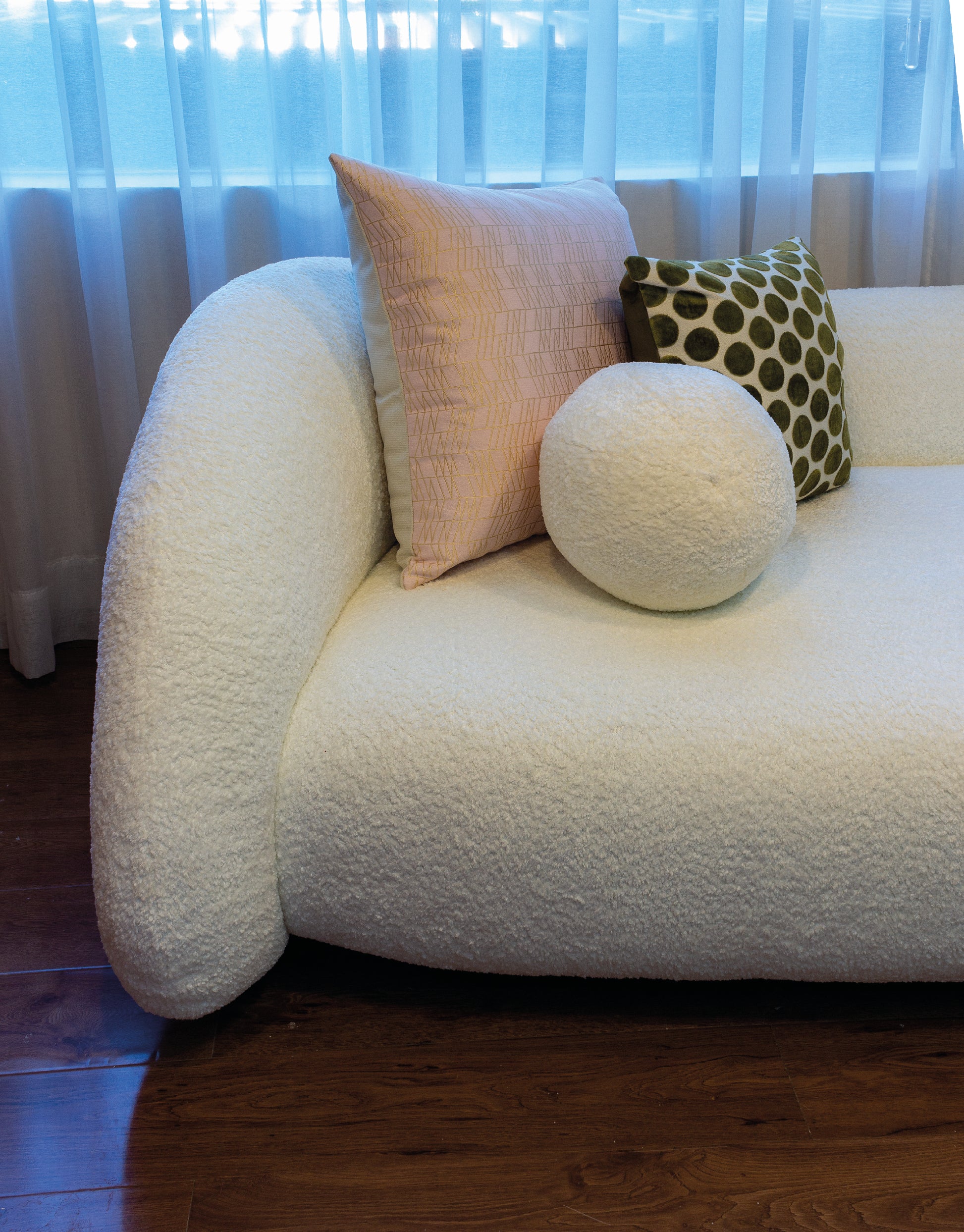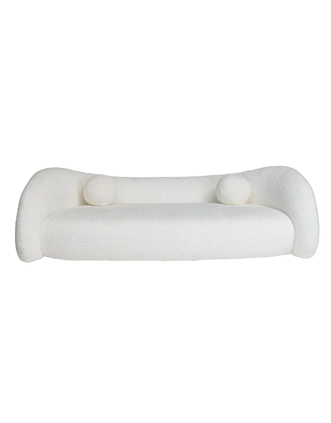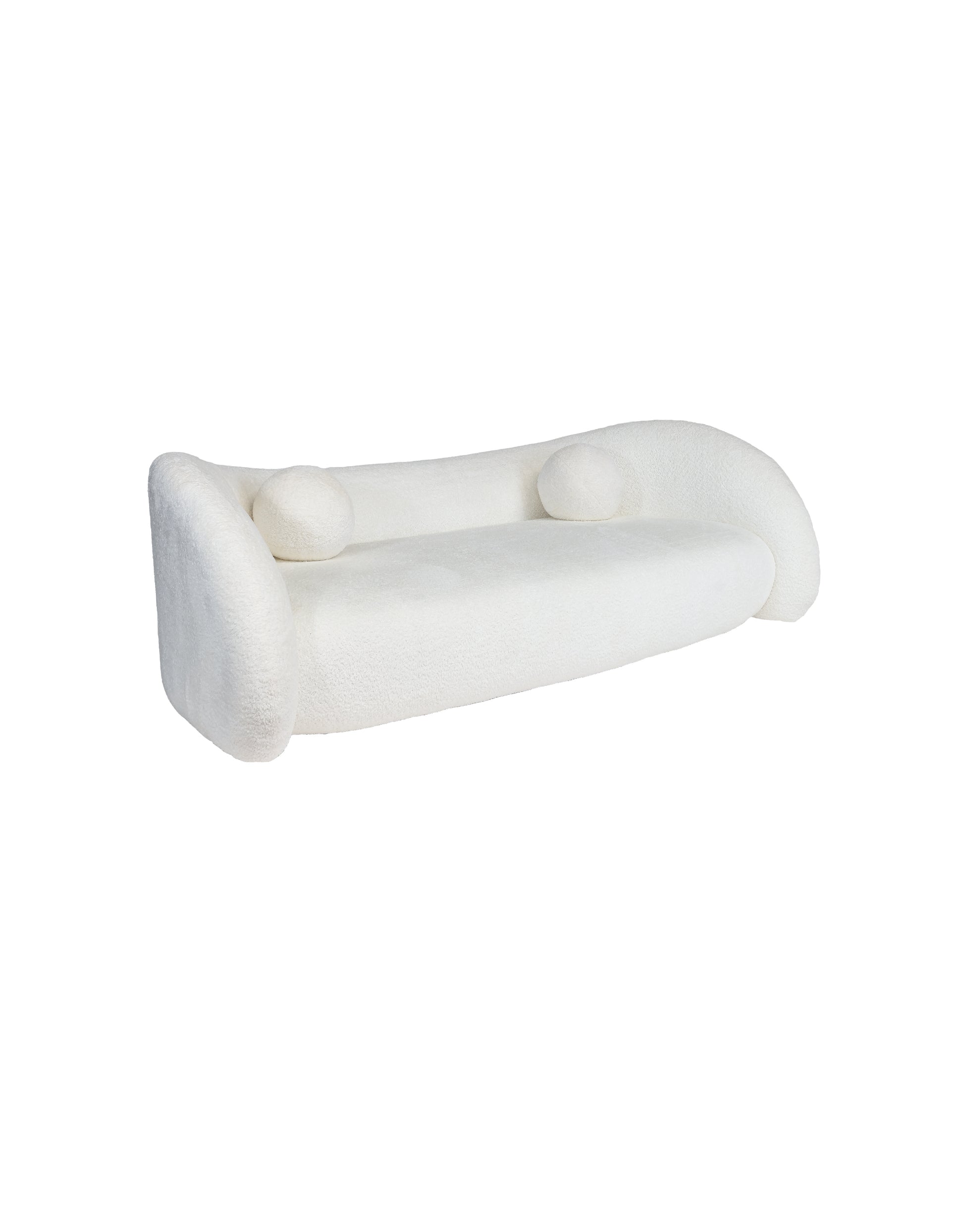 Este sofá presenta una silueta curvada y envolvente, con un diseño moderno y minimalista que aporta sofisticación a cualquier espacio. Sus cojines redondos complementan la estructura, brindando un toque único y elegante.