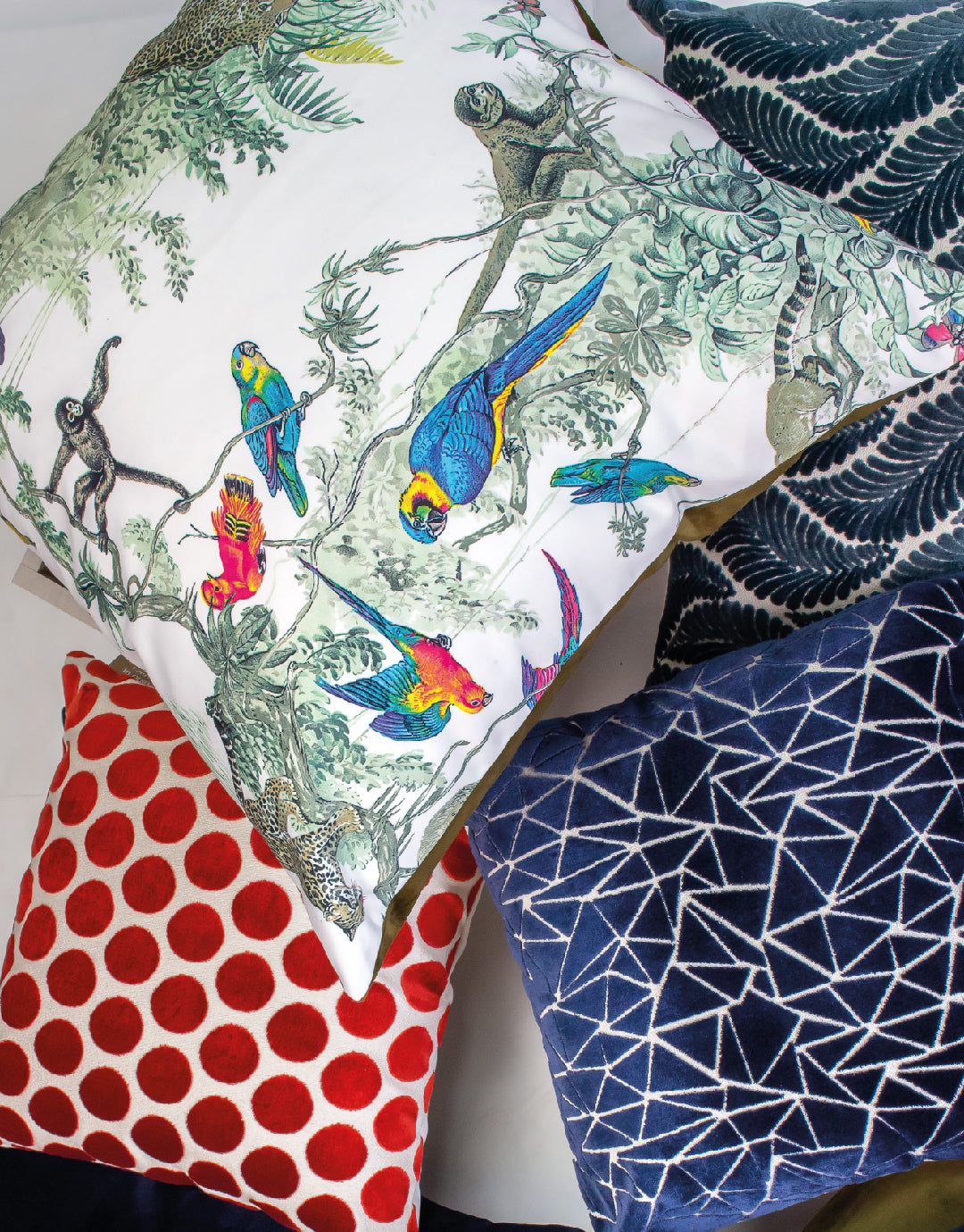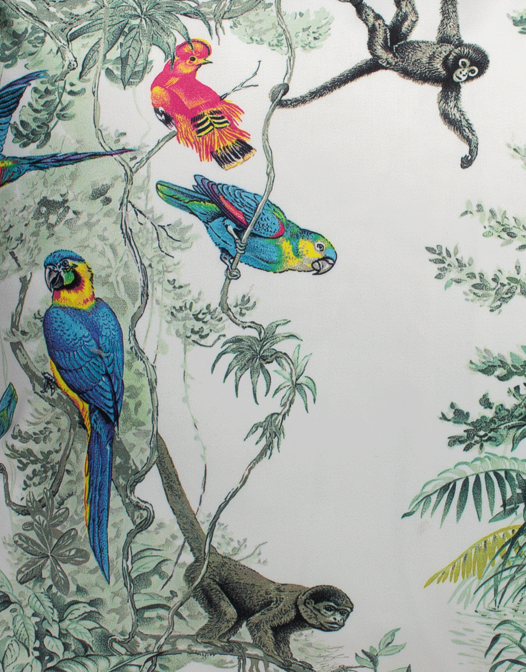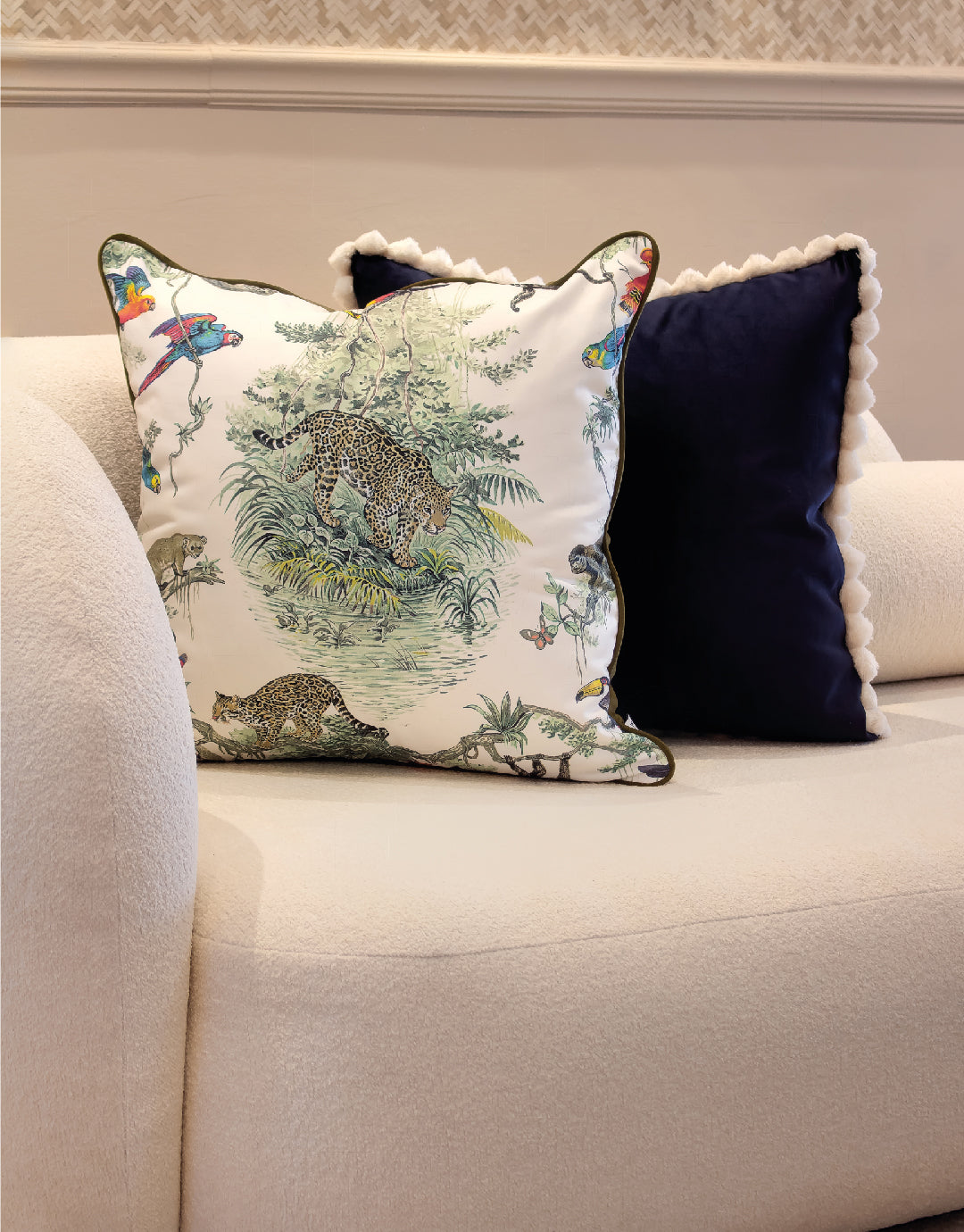 El cojín Bosque Tropical destaca por su vibrante diseño inspirado en la selva, con jaguares, loros y exuberante vegetación. Sus colores vivos y su composición detallada lo convierten en un elemento decorativo ideal para quienes buscan un toque exótico y sofisticado en sus espacios.