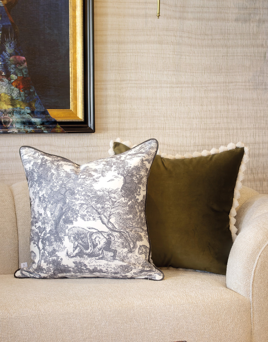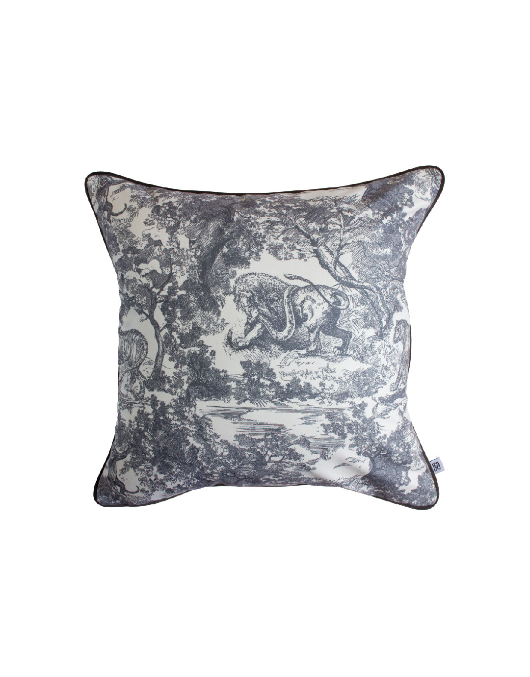 Añade un toque de sofisticación y elegancia a tu espacio con el Cojín Selva. Su diseño en tonos grises representa una escena selvática con detalles artísticos inspirados en el estilo toile de Jouy, ideal para ambientes clásicos y contemporáneos.