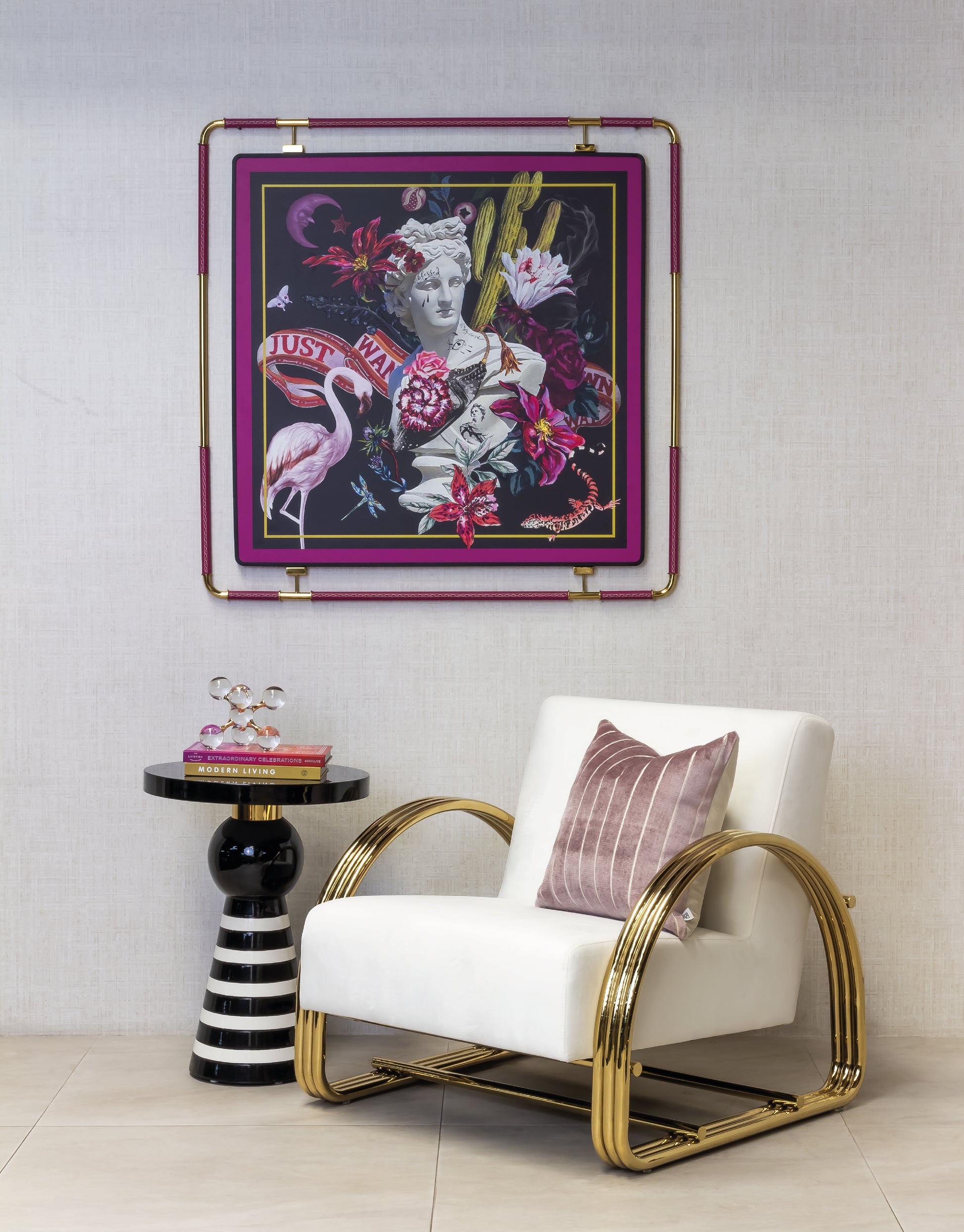 Obra de arte enmarcada con detalles dorados y rosados. La ilustración combina elementos clásicos y modernos con un busto de escultura adornado con flores exóticas, cactus, un flamenco y detalles en rojo y dorado. El fondo negro resalta los colores vibrantes y los elementos surrealistas. Un lazo con el texto "JUST WAIT" atraviesa la composición, añadiendo un mensaje intrigante.