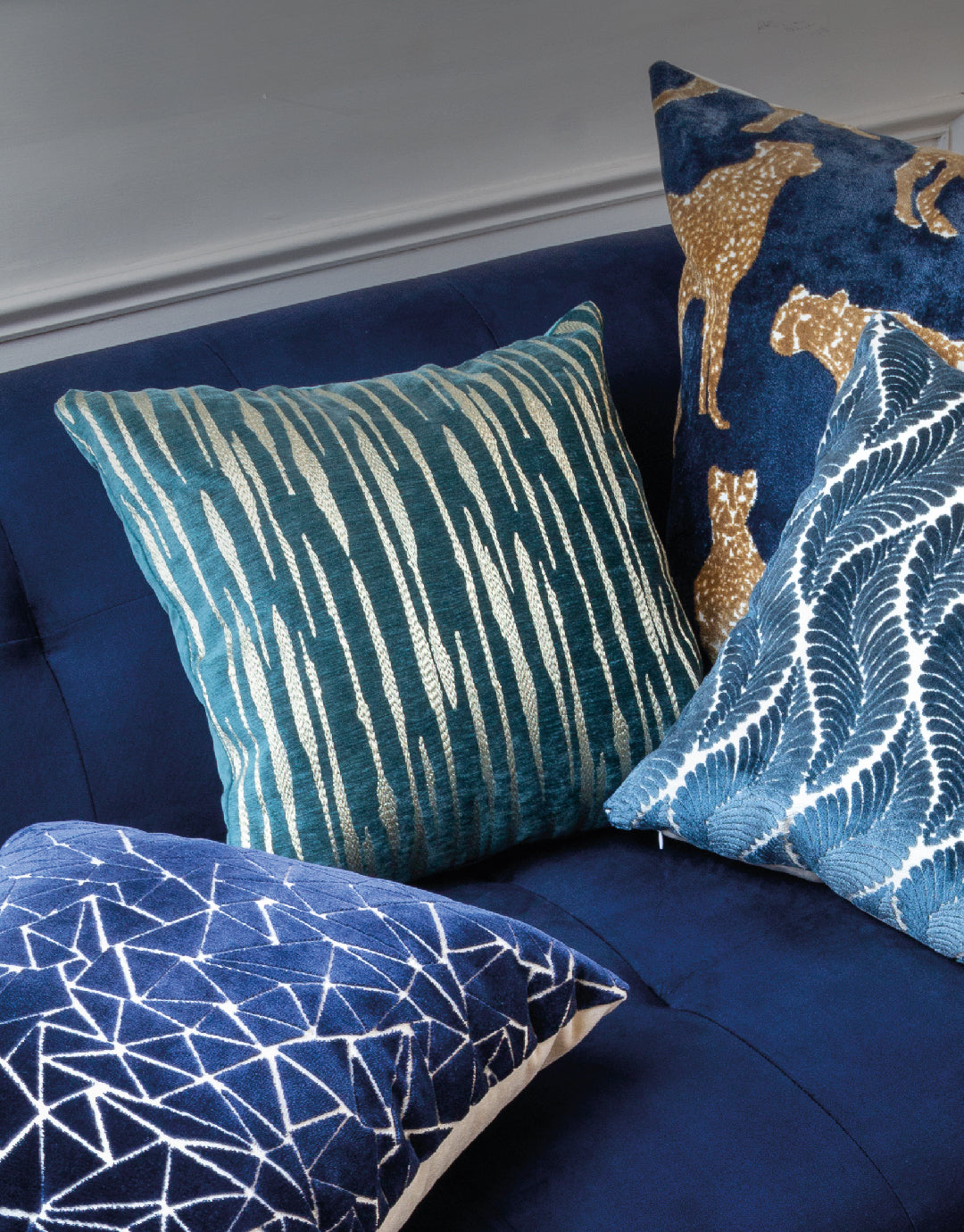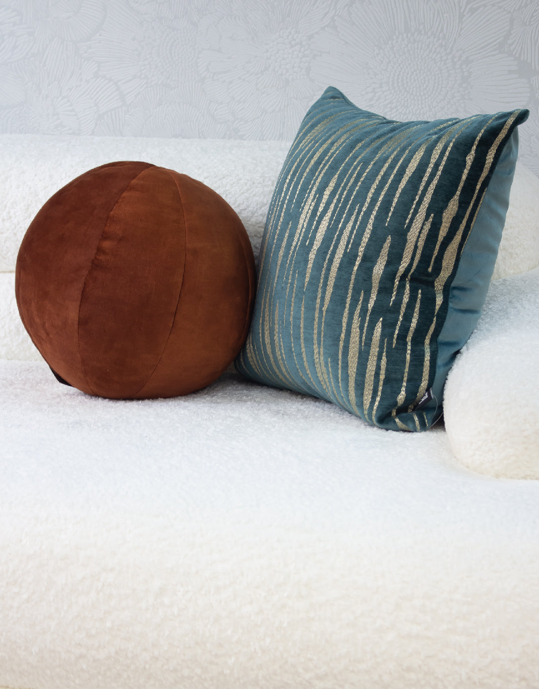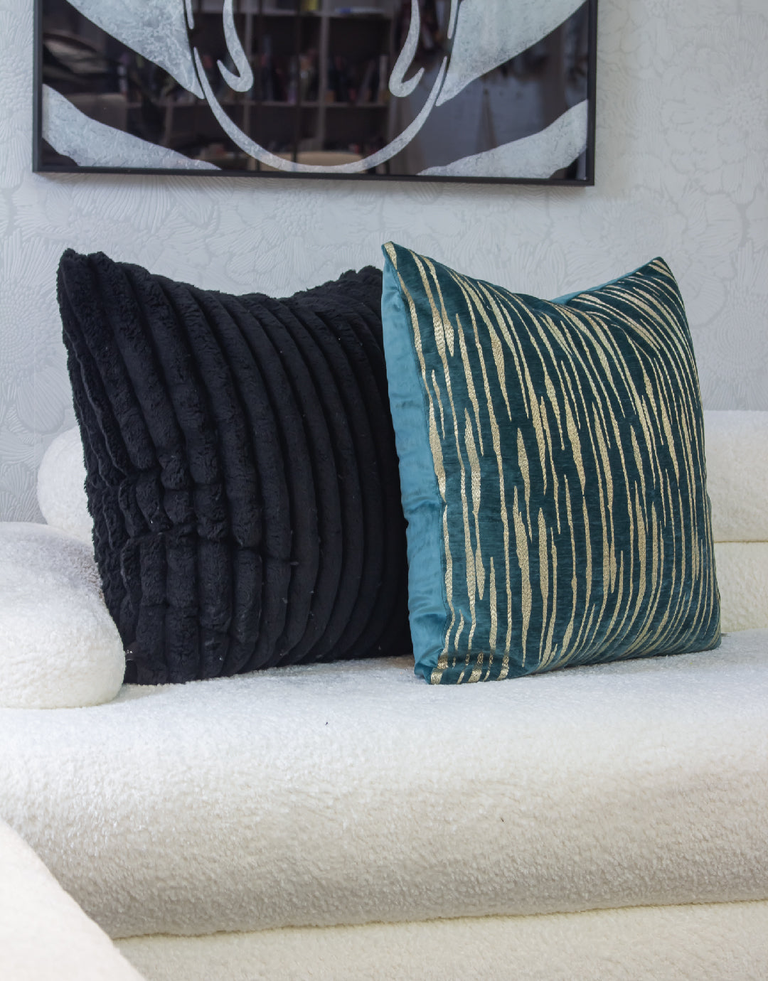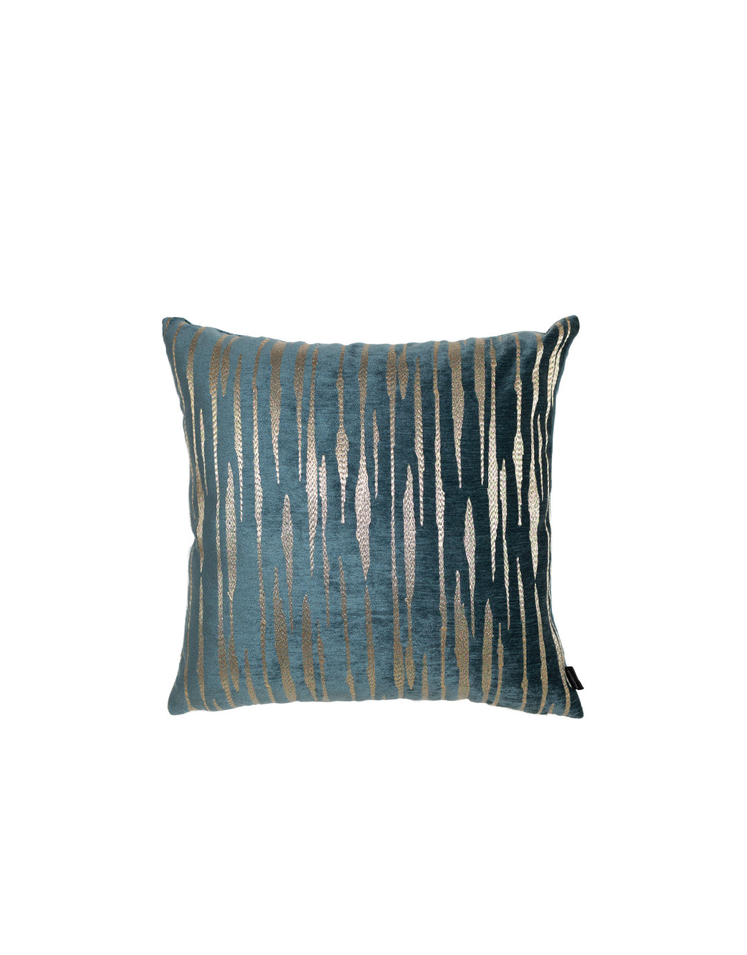 El Cojín Davos combina lujo y calidez con su tela aterciopelada en tono azul y detalles dorados en un patrón abstracto. Su diseño elegante y sofisticado lo convierte en el complemento ideal para sofás, sillones o camas, aportando un toque de brillo y textura a cualquier espacio.