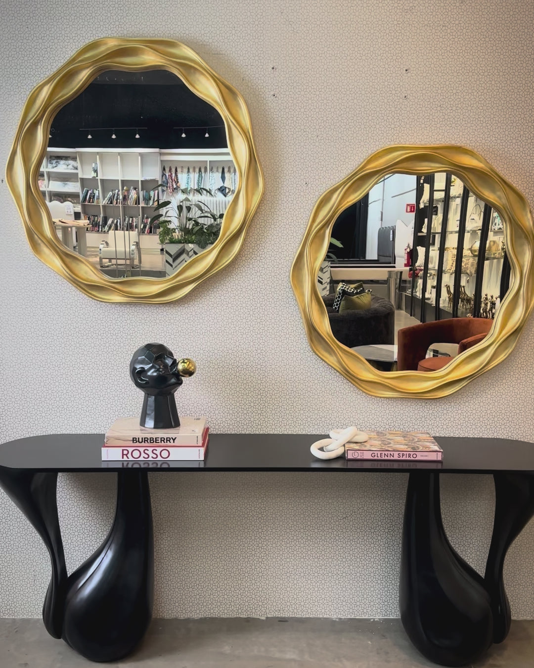 Este es otro espejo decorativo con un diseño moderno y sofisticado. Su marco dorado con un acabado ondulado le da un toque elegante y contemporáneo. Es ideal para agregar estilo y un toque de lujo a cualquier espacio