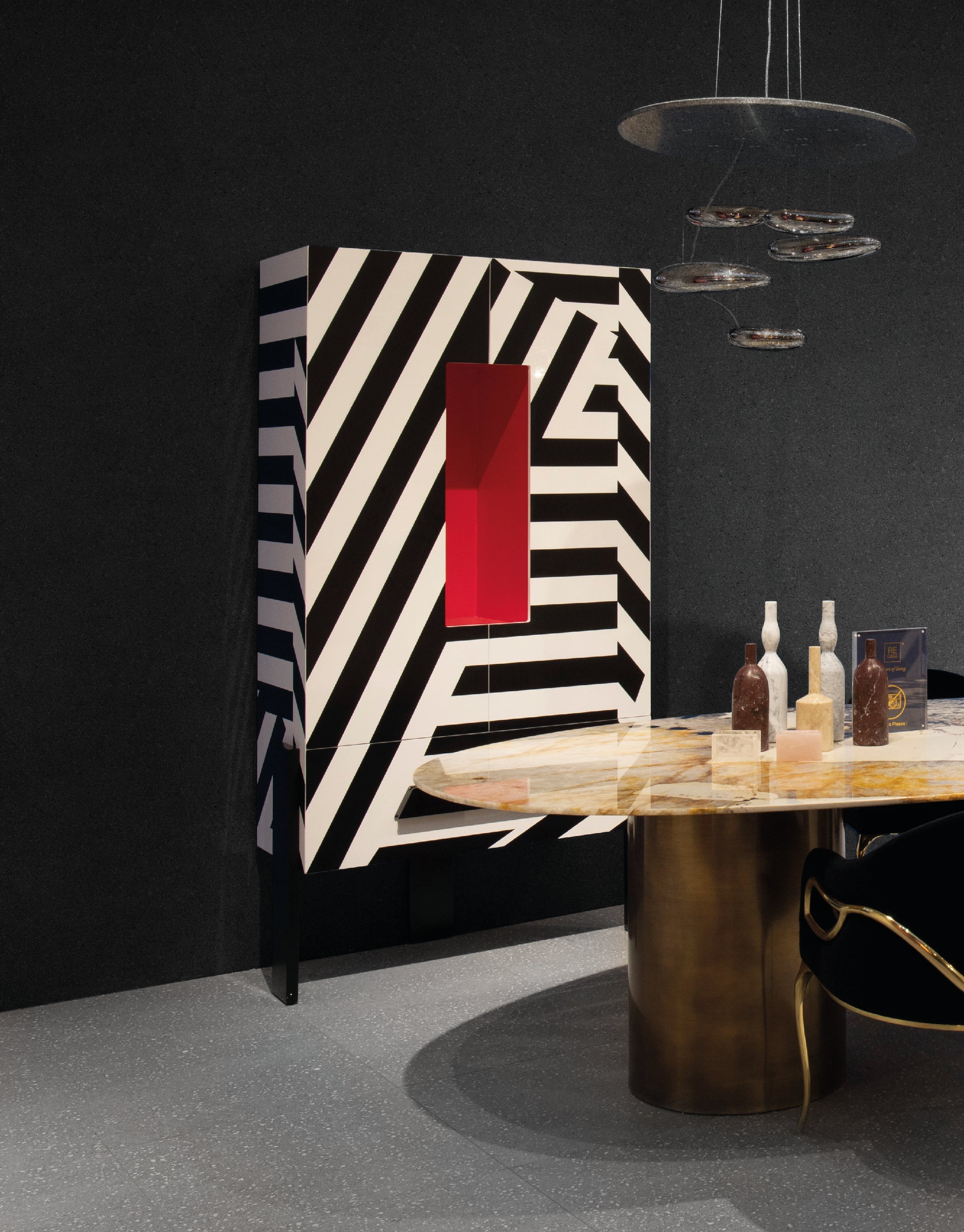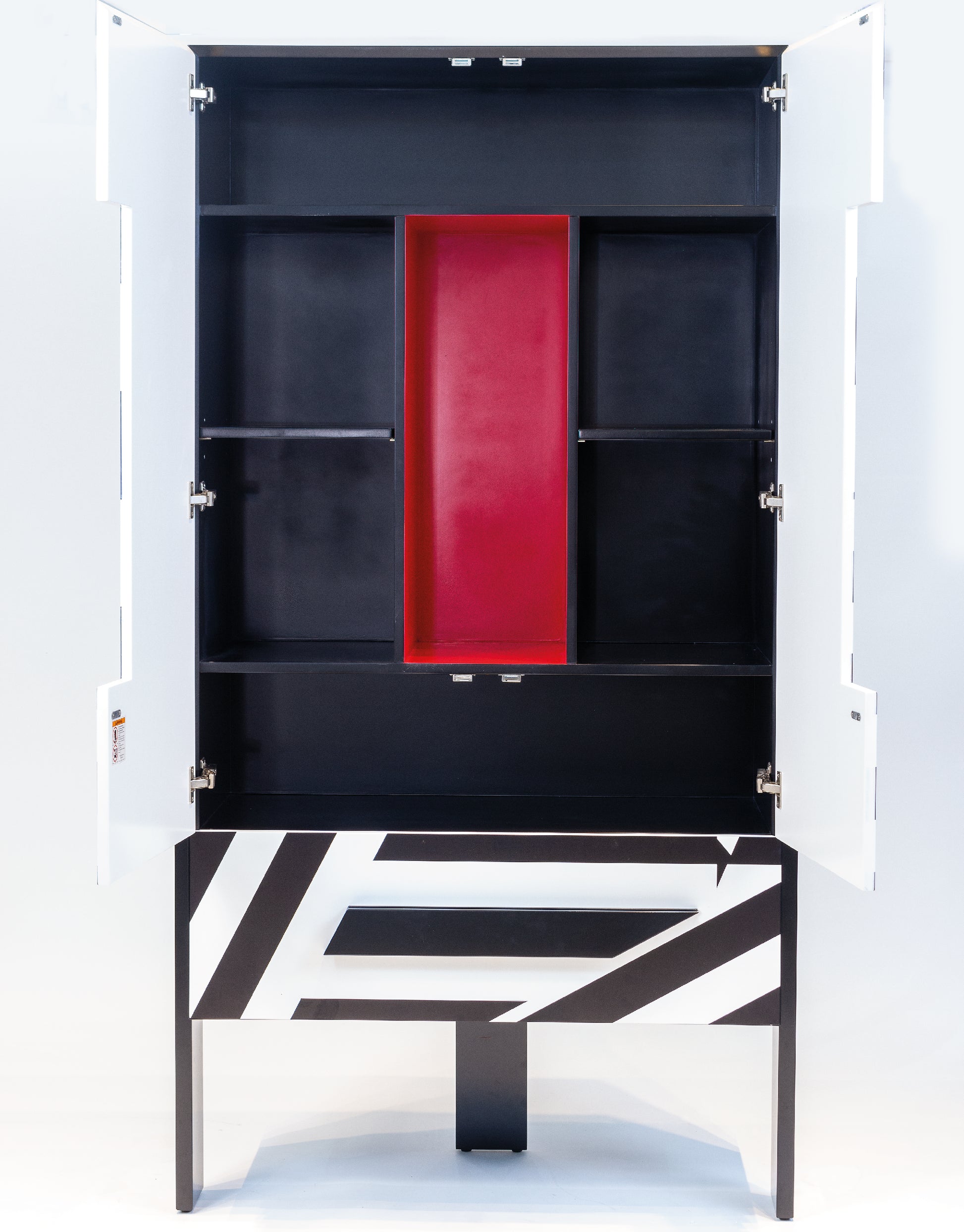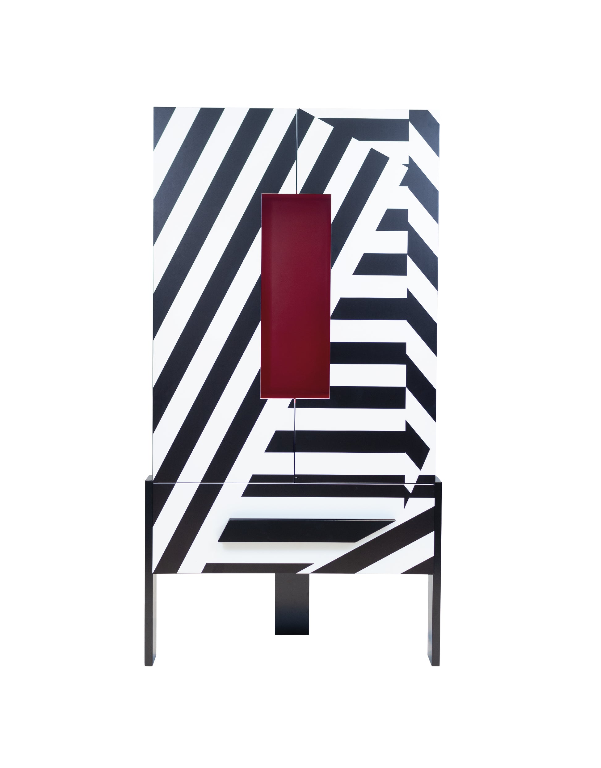 Transforma tus espacios con este armario decorativo de diseño contemporáneo. Su impactante patrón geométrico en blanco y negro, inspirado en el op-art, lo convierte en el protagonista perfecto de cualquier ambiente.